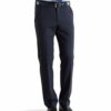 Rounded French pockets with additional hidden zip safety pocket. High quality interior design with colourful woven pocket pouches. Two hip pockets with buttons. Four way stretch wool. Easy care. Regular fit with slim silhouette. 53% Polyester 44% Wool 3% Elastane. 310g
